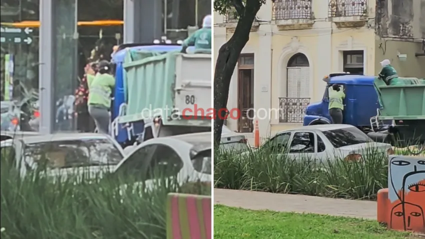 Las imágenes muestran a una trabajadora municipal agarrada de una de las ventanillas del vehículo que presta servicio para la recolección de residuos pesados, como ramas y escombros, en diferentes zonas de la capital chaqueña. La maniobra no solo representa una infracción básica de seguridad vial, sino que además expone a la persona a un riesgo grave de caída o accidente.