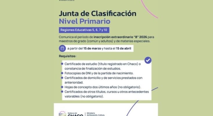 El Ministerio de Educación de la Provincia, a través de la Junta de Clasificación de Nivel Primario –Regiones Educativas 5, 6, 7 y 10, con sede en Resistencia– informa que se abrirá el período de inscripción extraordinaria “B” 2026 destinado a docentes que hayan obtenido su título con posterioridad al 15 de octubre de 2025.