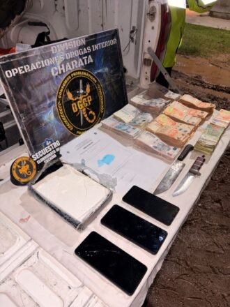 En el procedimiento secuestraron un paquete con 1.033 gramos de cocaína, tres teléfonos celulares, $5.486.850 en efectivo, dos cuchillos y un automóvil Volkswagen Vento.