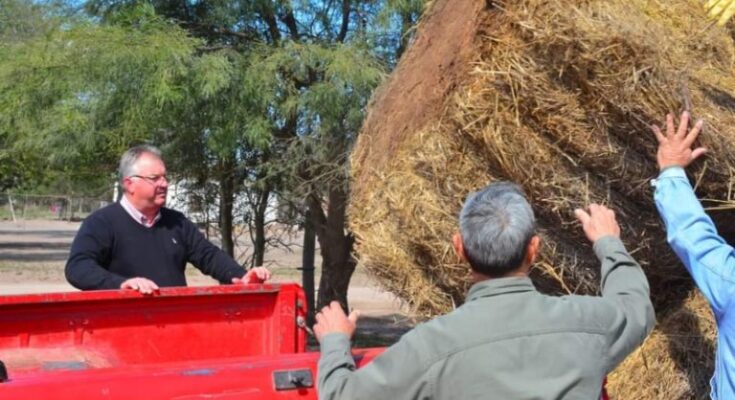 El intendente Pío Sander, junto a la secretaria de Producción y Desarrollo Local Jessica Kloster y la delegada municipal Mariana López, entregó pastura a productores locales afectados por la sequía, en una iniciativa para abordar la escasez de alimento para los animales.