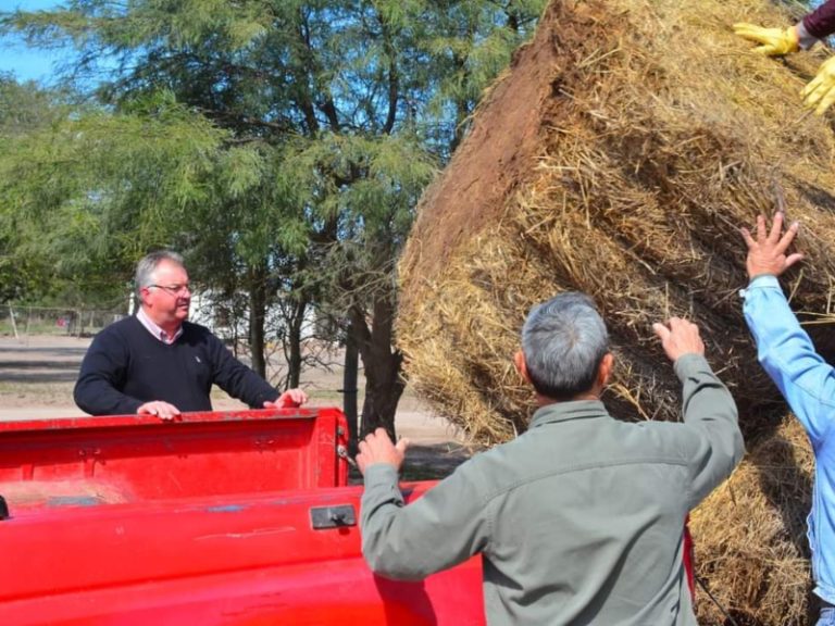El intendente Pío Sander, junto a la secretaria de Producción y Desarrollo Local Jessica Kloster y la delegada municipal Mariana López, entregó pastura a productores locales afectados por la sequía, en una iniciativa para abordar la escasez de alimento para los animales.