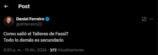 Este no fue el único comentario polémico. Daniel Ferreiro, exvocero de AFA y expresidente de Nueva Chicago, también se sumó al debate escribiendo: “¿Cómo salió el Talleres de Fassi? Todo lo demás es secundario”.