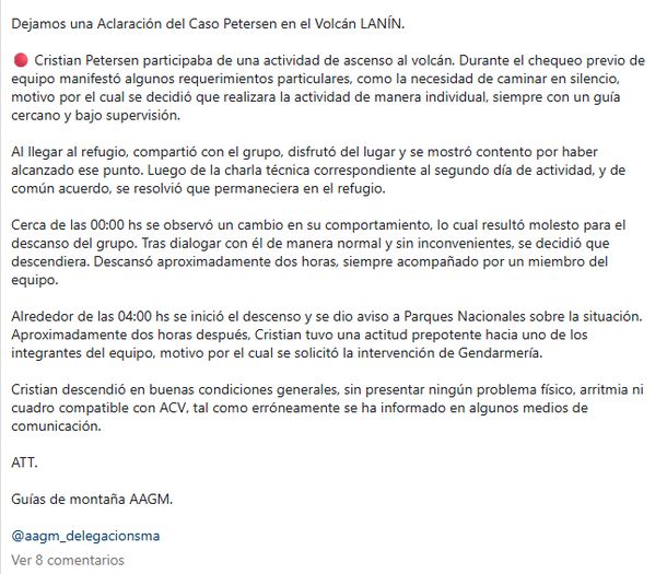 La Asociación detalló que, alrededor de la medianoche, Petersen exhibió una conducta inusual que afectó la tranquilidad del campamento. El comunicado sostiene que “Cerca de las 00 hs se observó un cambio en su comportamiento, lo cual resultó molesto para el descanso del grupo. Tras dialogar con él de manera normal y sin inconvenientes, se decidió que descendiera. Descansó aproximadamente dos horas, siempre acompañando por un miembro del equipo”.