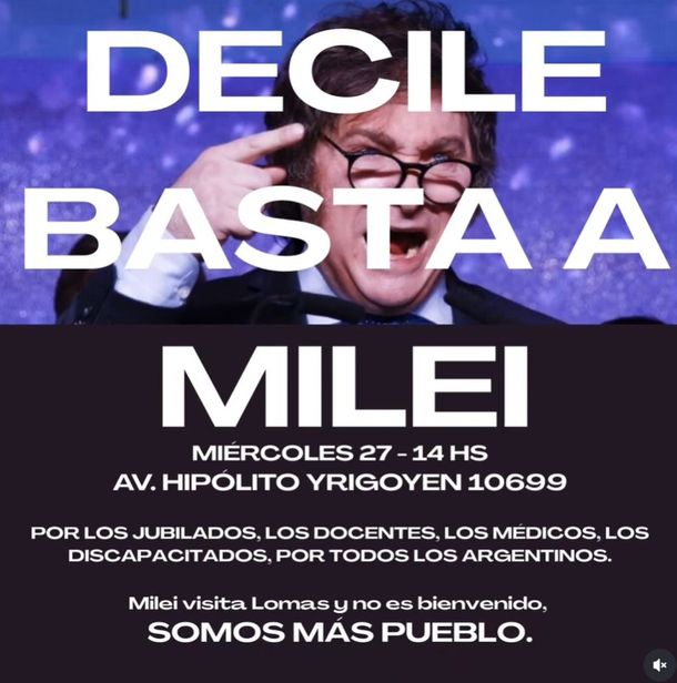 “Por los jubilados, los docentes, los médicos, los discapacitados, por todos los argentinos”, indica la invitación a la protesta y concluye: “Milei visita Lomas y no es bienvenido”.