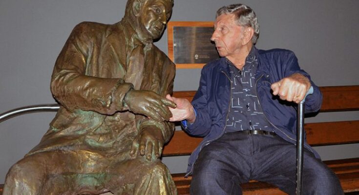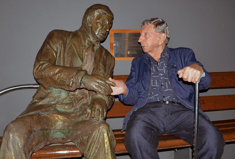 En una imagen que lo vuelve a pintar de cuerpo entero, apenas llegó al lugar del homenaje se sentó junto a su doble inanimado y mantuvo una breve charla con él.