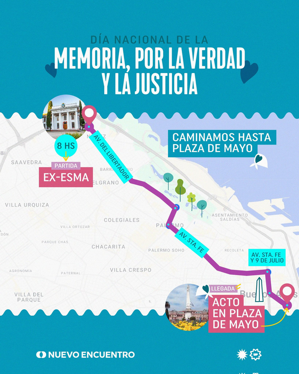 El recorrido de esta columna principal comenzó a las 8 en la exESMA y avanzará por Avenida del Libertador, Avenida Santa Fe y 9 de Julio, pasando por Callao y Santa Fe alrededor de las 13 y alcanzando el Obelisco a las 14. Posteriormente, continuará hacia Plaza de Mayo por Diagonal Norte.