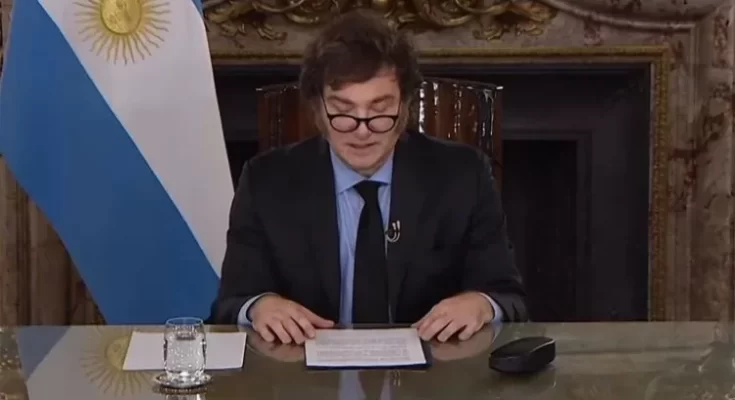 El mandatario, que estuvo acompañado por el ministro de Economía, Luis Caputo; el presidente del Banco Central, Santiago Bausili; el vicepresidente del Banco Central, Vladimir Werning; y el secretario de Finanzas, Pablo Quirno, expresó al inicio del discurso: «Entiendo que la situación que estamos viviendo es dura, ya hemos recorrido la mitad del camino. Esta vez el esfuerzo va a valer la pena«, y adelantó que anunciaría algo «que hace meses parecía imposible».