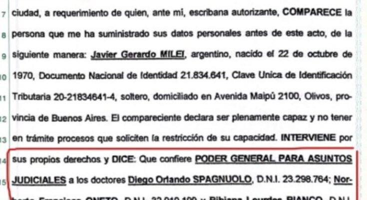 Este instrumento legal, que sigue vigente, habilita a Spagnuolo y a los otros dos abogados para que en nombre del presidente «inicien, intervengan y prosigan hasta su total terminación las acciones judiciales y/o extrajudiciales, pendientes o que se inicien en las que el poderante (Milei) esté interesado».