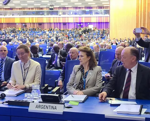 «En un escenario global de inestabilidad y tensiones geopolíticas, la Argentina hace un llamado a que cesen la retórica nuclear y la amenaza del uso de armas nucleares, cuyo uso es inaceptable. La Argentina se hace eco, a su vez, del llamado realizado por el Director General a que se eviten acciones que puedan poner en peligro o dañar instalaciones nucleares o con material radioactivo en el contexto de conflictos armados. La seguridad tecnológica nuclear y la seguridad física nuclear deben prevalecer», afirmó la ministra.