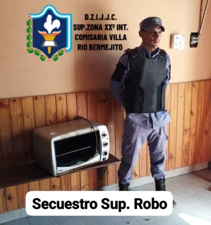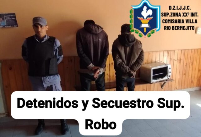 Más tarde, a las 08:00 horas, en el barrio Club Sáenz Peña de Villa Río Bermejito, se reportó un robo en proceso. Gracias a un llamado anónimo, el personal de guardia actuó rápidamente y logró aprehender a dos hombres mayores de edad, quienes tenían en su poder un horno eléctrico gris, marca Atma, que había sido denunciado como sustraído.