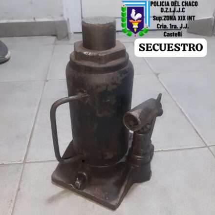 Por la tarde, a las 20:30 horas, se registró un hurto en una gomería ubicada en la calle Moreno 390 de la ciudad de Juan José Castelli. El propietario, D. M. N., de 41 años, denunció que un desconocido le sustrajo un gato hidráulico de 15 toneladas mientras trabajaba. Gracias a la rápida investigación del personal del servicio externo, se logró recuperar la herramienta en otra gomería de la localidad, y se está trabajando para identificar y aprehender al autor del hecho.