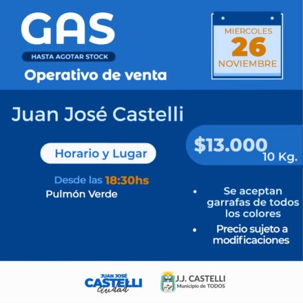 La Municipalidad de Juan José Castelli acompañará y coordinara este miércoles 26 de noviembre un operativo especial de venta de gas en garrafas, una iniciativa destinada a facilitar el acceso al servicio a precios accesibles para los vecinos de la localidad.