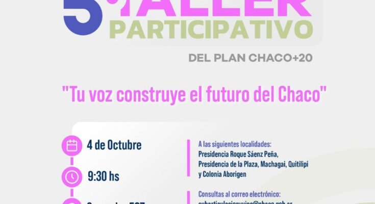 El Gobierno de la Provincia del Chaco, a través de la Secretaría de Coordinación de Gabinete, invita a representantes de instituciones intermedias, cámaras empresariales, entidades y organizaciones socioeconómicas, culturales y deportivas, entre otras, a participar en los Talleres del “Plan Estratégico Participativo Chaco+20”.