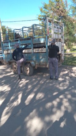 Días atrás un conocido ganadero de la zona Paraja Cabeza buey, dió cuenta ser victima de la sustracción de una animal vacuno de su propiedad, tipo ternero, según indicios supuestos autores movilizarían en vehiculo, iniciandose una etapa investigativa, averiguaiones reservadas prácticadas en la zona, y desde seguimientos huellas, pudo establecer que supuestos autores serían personas residentes en cercanías a zona del daminificado, por tal motivo, munido orden judicial (allanamientos), se requizaron (02) dos inmuebles rurales, con resultado positivo, logrando SECUESTRO (01) una camioneta, marca toyota, con manchas simíl sangre parte caja carga, neumaticos coincidentes con rastros hallado lugar suceso, asimismo fueron incautados elementos utilizados para mencionado delito, como ser cuchillo, ganchos, sierras, lazos, sogas, arma fuego tipo escopeta, cartuchos, aparejo, y tambien producto carneo vacuno, extremidades, cabeza todo animal vacuno; todos inidicios presumiblemente coincidentes con semoviente sustraído, tal sentido tres masculinos mayores edad fueron DETENIDOS y puetos disposición de la justicia.