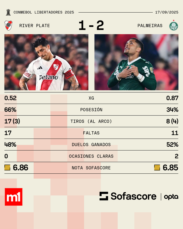 Final del primer tiempo: Palmeiras le gana 2-0 a River