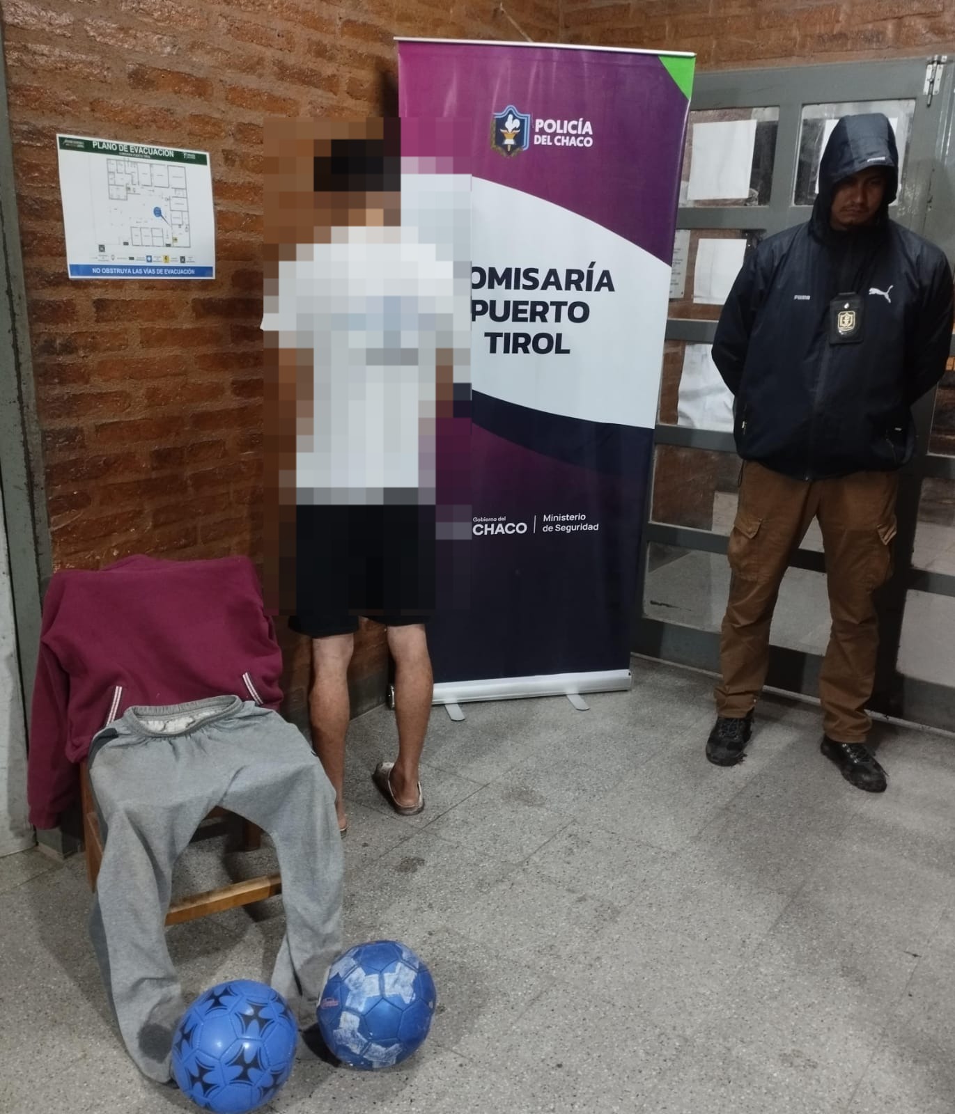 El procedimiento se llevó a cabo en la calle Beligoy del barrio Los Aromos, donde los uniformados identificaron al sospechoso que transportaba en sus manos dos pelotas de fútbol color azul, denunciadas como sustraídas horas antes.