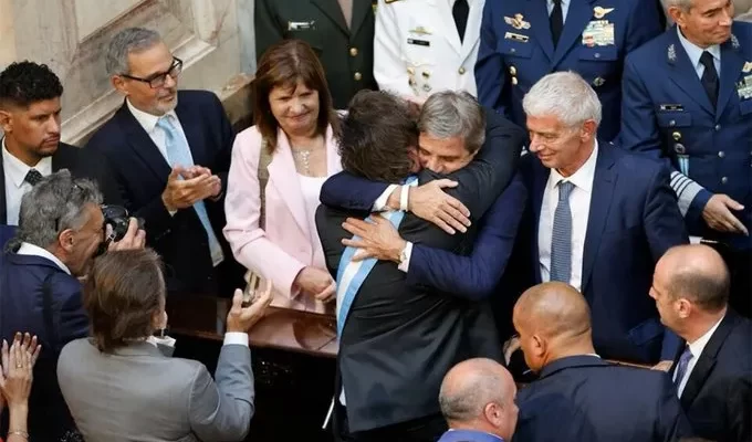 El presidente Javier Milei celebró la noticia en sus redes sociales con una foto en la que se lo ve fundido en un abrazo con el ministro de Economía, Luis Caputo, y el comentario «GOOOOOOOOOOOOL…!!!».