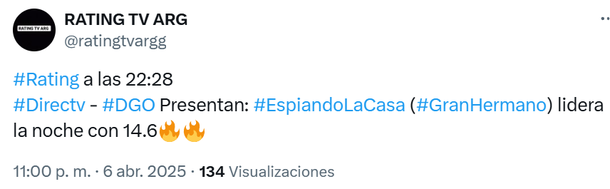Así arrancó Gran Hermano este 6 de abril, que a pocos minutos minutos de iniciar el programa ya superaba los 15 puntos de rating.