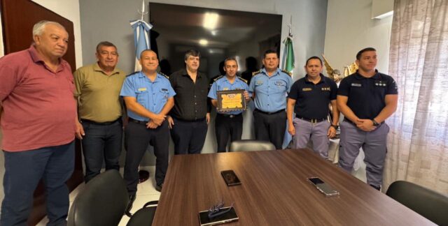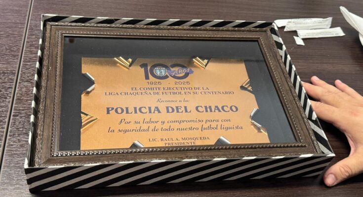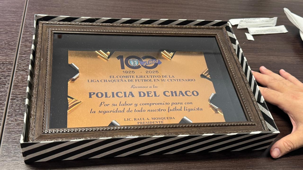 Las autoridades deportivas entregaron la placa de reconocimiento a las máximas autoridades institucionales en agradecimiento a la labor que realiza la Policía del Chaco en los diferentes eventos deportivos que se desarrollan en toda la provincia en el marco de la celebración del Centenario de la Liga Chaqueña de Futbol.