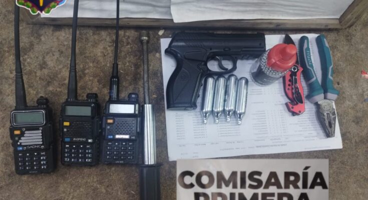 Durante el procedimiento, los efectivos secuestraron tres radios portátiles, un bastón extensible, una navaja táctica, una pistola de aire comprimido con cápsulas de CO2 y balines, además de una pinza industrial, elementos que uno de los demorados no supo justificar.