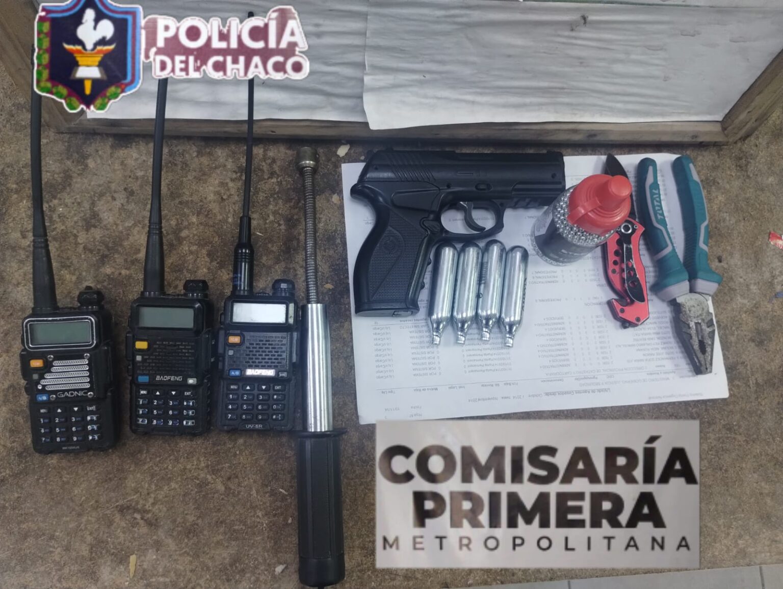 Durante el procedimiento, los efectivos secuestraron tres radios portátiles, un bastón extensible, una navaja táctica, una pistola de aire comprimido con cápsulas de CO2 y balines, además de una pinza industrial, elementos que uno de los demorados no supo justificar.
