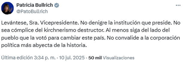 Bullrich y un patotero tuit contra Villarruel: «No sea cómplice del kirchnerismo»