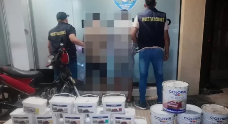 Fue así que se dirigieron hasta la calle 18, Ensanche Sur, donde detuvieron a dos hombres de 46 y 28 años, los mismos iban a bordo de una Zanella ZB 110 cilindradas, teniendo en poder ocho baldes de pinturas marca Colorín y dinero en efectivo.