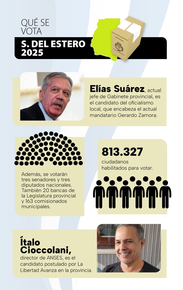 Por la oposición, LLA postula para la gobernación a Italo Cioccolani, exreferente del PRO y actual titular de la UDAI Santiago, de la ANSES. El frente Despierta Santiago, integrado por el radicalismo no zamorista, el PRO y el Movimiento Viable, una suerte de exJuntos por el Cambio de menor peso, va con el diputado provincial radical Alejandro Parnás como candidato a gobernador. La cuarta postulación opositora a la gobernación es la de Verónica Larcher, por el Frente Renovador, aunque se presume que solo en La Banda, en donde el intendente es del mismo signo político, haría una elección relevante, pues en el resto de la provincia su escasa militancia habría cerrado acuerdos con el oficialismo zamorista.