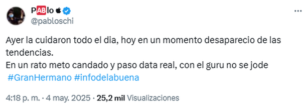 Por otro lado, Pabloschi apareció nuevamente en las redes sociales y lanzó otra bombita, que desató nuevamente el debate y dejó a la gente con más dudas que certezas. «Ayer la cuidaron todo el día, hoy en un momento desapareció de las tendencias. En un rato meto candado y paso data real, con el gurú no se jode», puso en su cuenta.