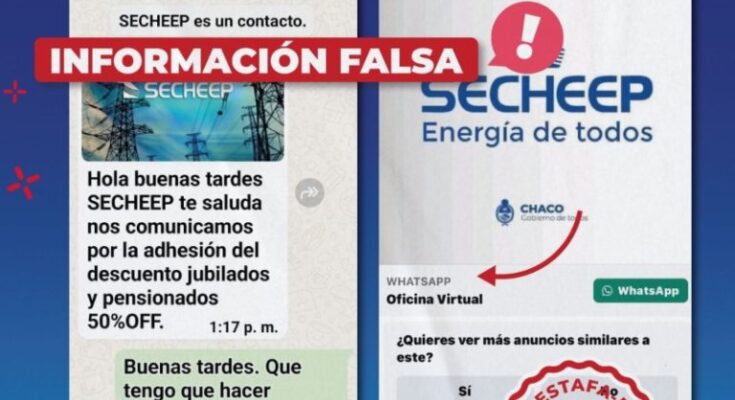 Desde la empresa energética informaron que los estafadores, a través de perfiles falsos (como las detectadas: Secheep 50%DESCUENTOS Jubilados o Secheep 2024) se contactan con los clientes mediante mensajes de WhatsApp o de teléfono solicitando datos personales o financieros (como home banking, CBU, números de tarjetas, etc.) para, supuestamente, otorgar descuentos en las facturas o realizar la adhesión al subsidio nacional a la tarifa eléctrica, lo cual es absolutamente falso.