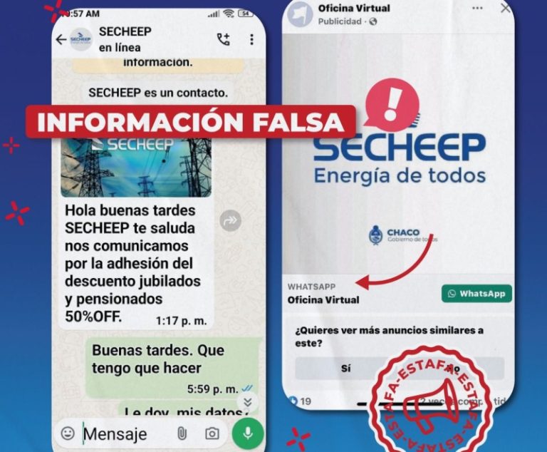 Desde Secheep informa que son varias las denuncias de clientes que afirman haber recibido este tipo de intentos de estafas. En ese contexto, se reitera a la población que la empresa energética no realiza llamados telefónicos a sus clientes y que toda la información veraz y correcta se comunicará sólo por las vías de comunicación oficiales. Ante cualquier duda, se puede consultar llamando al 0800-7777-589 o por mensaje, al número de WhatsApp 364-4-377044.