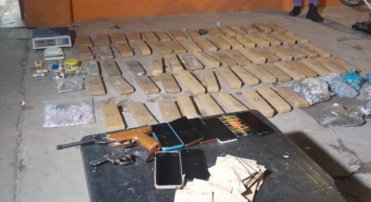 Al ingresar al domicilio, los efectivos fueron violentados por varias personas que intentaban entorpecer el procedimiento. A pesar de esto, lograron asegurar el lugar y encontraron una segunda caja de cartón con más paquetes similares. En total, se secuestraron 64 kilogramos de marihuana distribuidos en 36 paquetes y 1676 envoltorios de cannabis. También se hallaron dos armas de fuego, 7 gramos de cocaína, 38 cigarrillos de marihuana, cinco balanzas digitales, dos bicicletas, 9 celulares, $55.400 en efectivo, una pistola de aire comprimido y un revólver calibre.