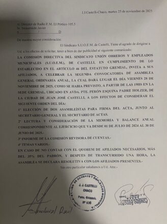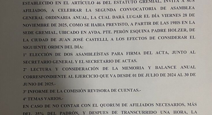 La comisión directiva del sindicato unión obreros y empleados municipales (S.U.O.E.M.), de Castelli, en cumplimiento de lo establecido en el artículo 46 del estatuto gremial, invita a sus afiliados, a celebrar la segunda convocatoria de asamblea general ordinaria anual, la cual dará lugar el día viernes 28 de noviembre de 2025, como se había previsto, a partir de las 19:00 hs en la sede gremial, ubicado en avda. Pte. Perón Esquina Padre Holzer, de la ciudad de Juan José Castelli, a los efectos de considerar el siguiente orden del día: