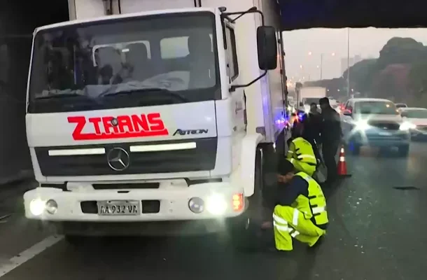 Según informaron fuentes oficiales, el vehículo impactó contra la base del paso elevado y quedó inmovilizado en el carril lento, lo que generó una reducción en la capacidad de circulación. El incidente, además de ocasionar demoras, puso en evidencia una infracción, ya que de acuerdo con la normativa vigente el camión no estaba habilitado para transitar por ese sector.