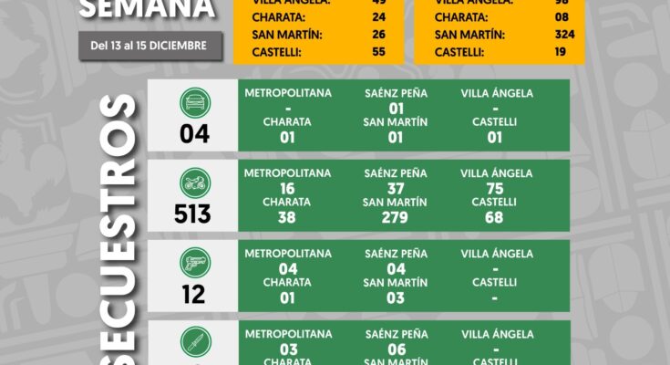 En Villa Ángela se realizaron 49 operativos y se demoró a 98 personas. También se incautaron 76 motos (una con pedido de secuestro) y un arma de fuego. En Charata, se realizaron 24 operativos donde se demoró a ocho personas y se incautaron 39 motos (una buscada por la justicia), un auto y un arma de fuego.