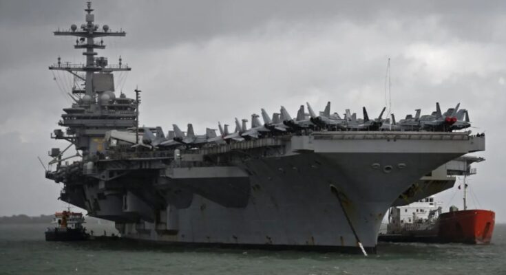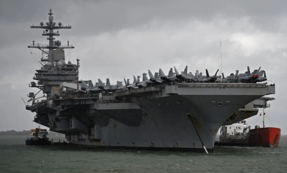 Debido a su tamaño (332 x 317 metros) no podrá amarrar en ningún puerto de nuestro país y permanecerá en aguas jurisdiccionales argentinas, escoltado por el USS Porter y el buque logístico USNS John Lenthall.