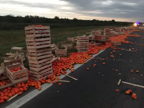 A las 7 de este martes, la Policía recibió un llamado telefónico, dando aviso sobre el vuelco del acoplado de un camión Mercedes Benz, proveniente de Jujuy. El rodado transportaba cajones de mandarinas.