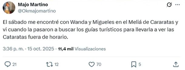 Pero lo que llamó la atención fue una particular revelación de la periodista Majo Martino en su red social X . Según contó, Wanda y su pareja realizaron una solicitud especial a las autoridades del parque: querían recorrer las Cataratas sin la presencia de otros turistas.