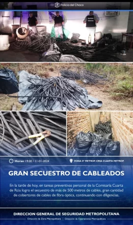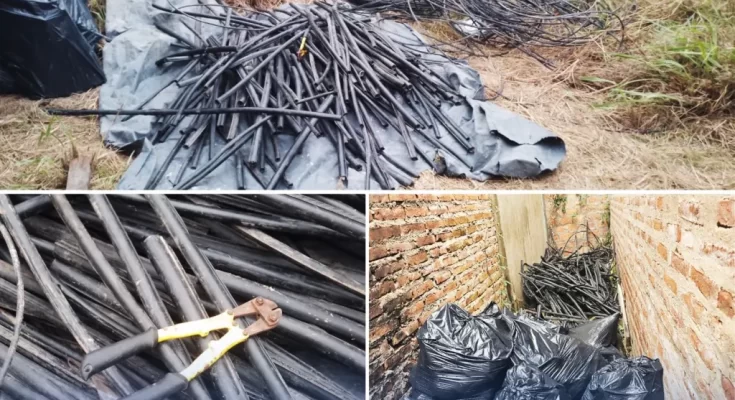 Al inspeccionar la misma, dieron con unos 500 metros de cable de fibra óptica, una hormigonera, dos tachos de caite de 200 litros cada uno, un termotanque, una cama de una plaza y dos colchones de una plaza cada uno. Procedieron a incautar la totalidad y lo trasladaron hasta la dependencia policial, donde conforme lo dispuesto por la Fiscalía en turno, se instruyan actuaciones judiciales por “Supuesta Investigación Actuada” para determinar las procedencias e investiguen quienes son los autores.